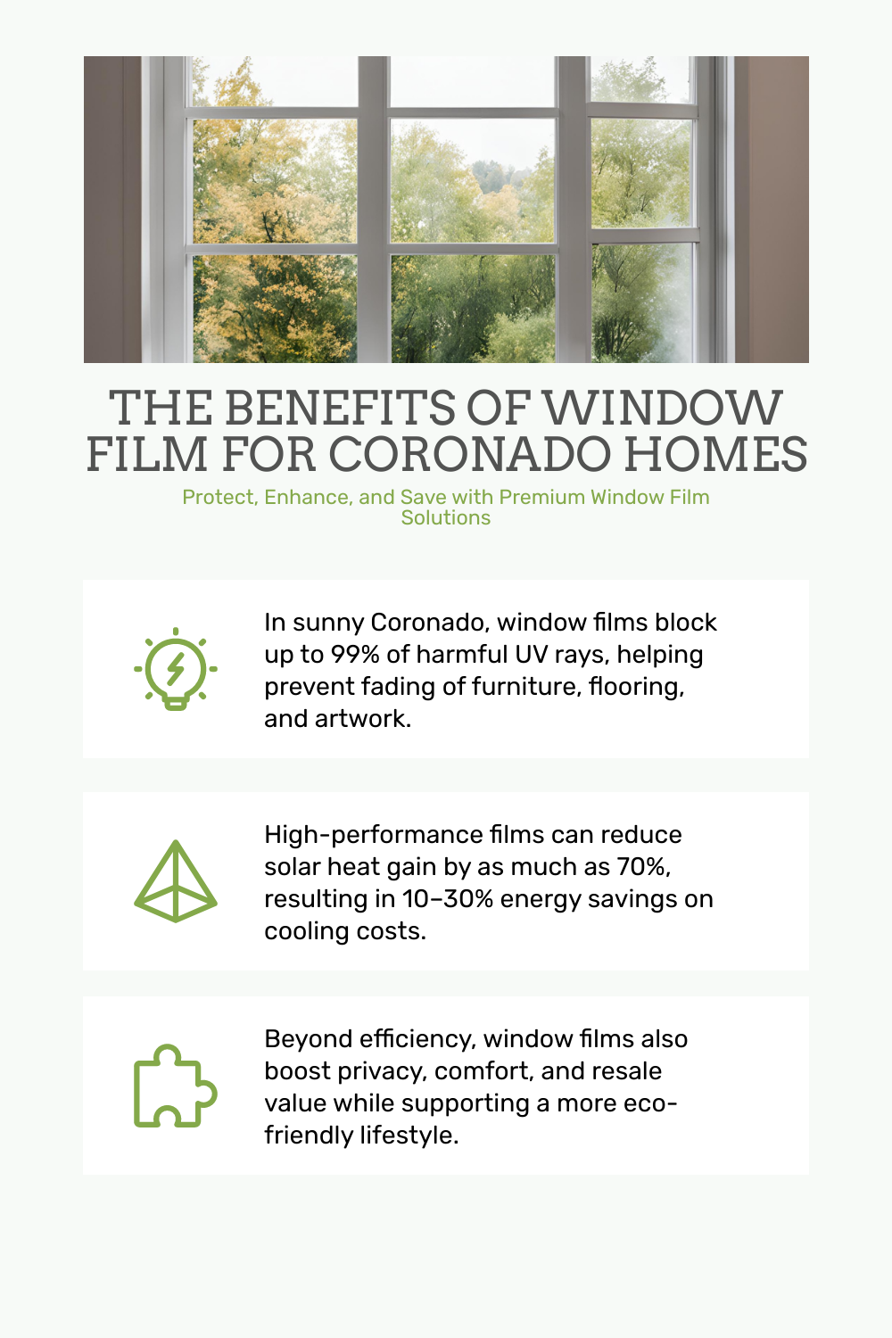 In the charming city of Coronado, known for its picturesque beaches and vibrant community, homeowners face unique challenges due to the city’s coastal environment. The intense sunlight, along with high UV levels, can cause significant discomfort and damage to homes, making high-quality window films not just a luxury but a necessity. At San Diego Window Film, we understand these challenges and offer solutions that enhance both the comfort and efficiency of your homes.
